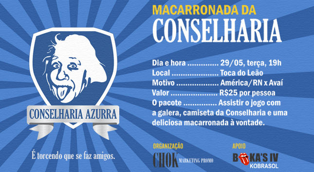 E por que raios esse nome? Porque, além amantes de comida e cerveja, são um bando de gente cheia de opiniões, de soluções para todos os problemas e de conselhos os mais diversos para dar sobre tudo que envolve o Avaí. O símbolo foi escolhido a dedo: um Einstein linguarudo, que representa suposta sabedoria e irreverência. Quer saber como faz pra fazer parte da turma? Fica ligado no convite aí acima e participe deste grupo prá lá de boa praça e mandar e-mail para contato@conselharia.com.br com seu nome e telefone para garantir o seu passaporte que aliás está no 2º lote e termiando. Simples assim!