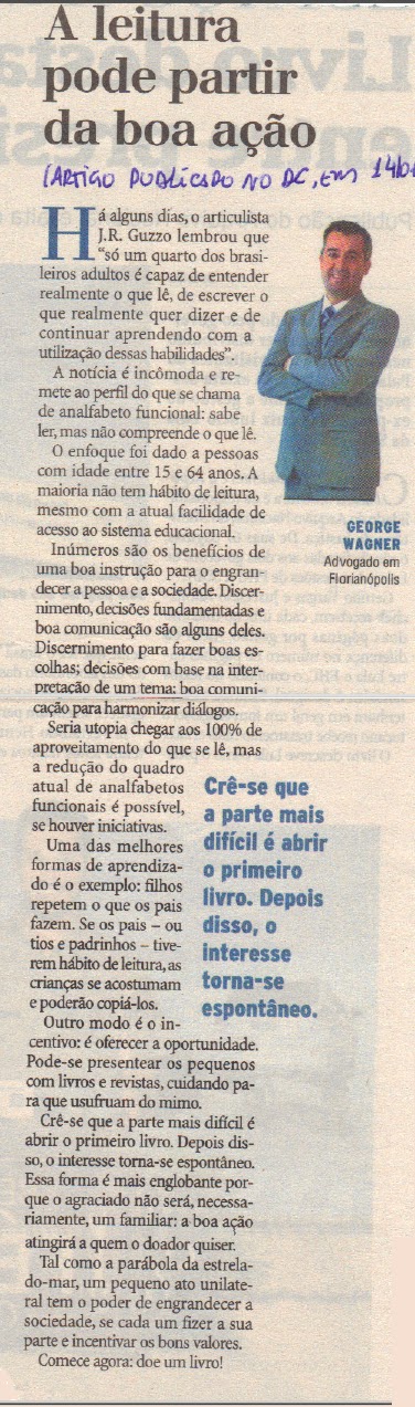 O artigo do meu amigo, avaino e advogado George Wagner que foi publicado no DC do dia 14, falando sobre a importância da leitura para o entendimento do que lê, assim como escrever o que realmente quer dizer. Leitura bem interessante. Parabéns mô quirido!