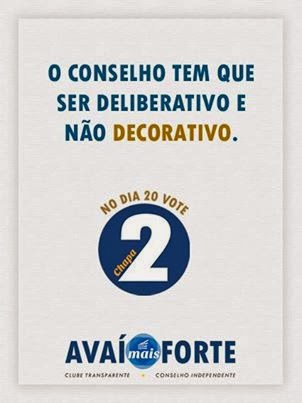 A Chapa 2 - tem propostas. Estamos neste últimos doze anos esperando pelas reformas, mudanças e transformações. O Avaí é nosso, do torcedor e não de uma só pessoa como temos ouvido falar. Portanto, conheça nossos comprometimentos e venha conosco fazer um AVAÍ MAIS FORTE.